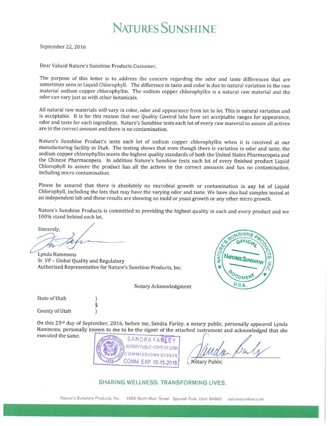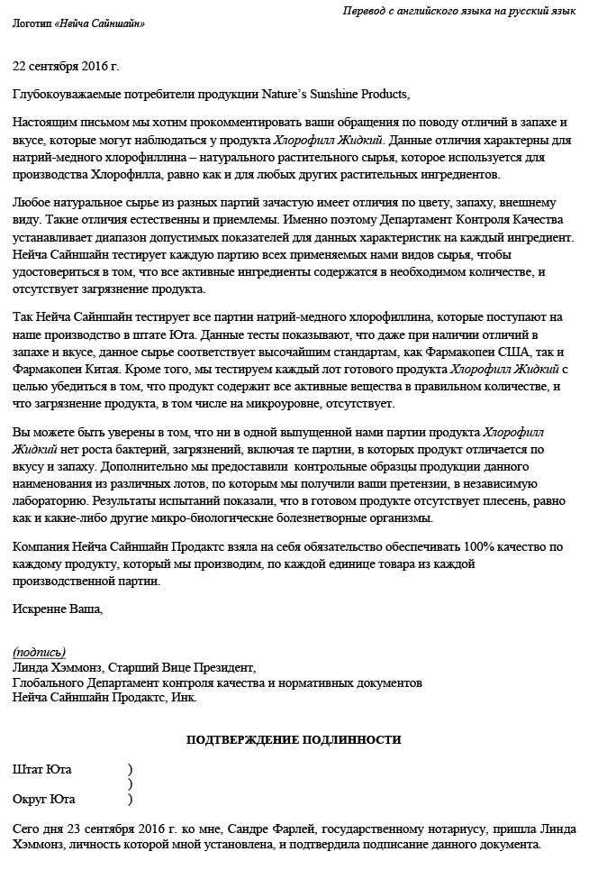 В cвязи с вопросами, возникающими по поводу изменившегося вкуса и запаха Хлорофилла, мы направили запрос в департамент контроля качества в Америку. Вице-президент компании, руководитель департамента Линда Хэммонз дала официальный ответ. Мы публикуем здесь в отдельных файлах оригинал и перевод.